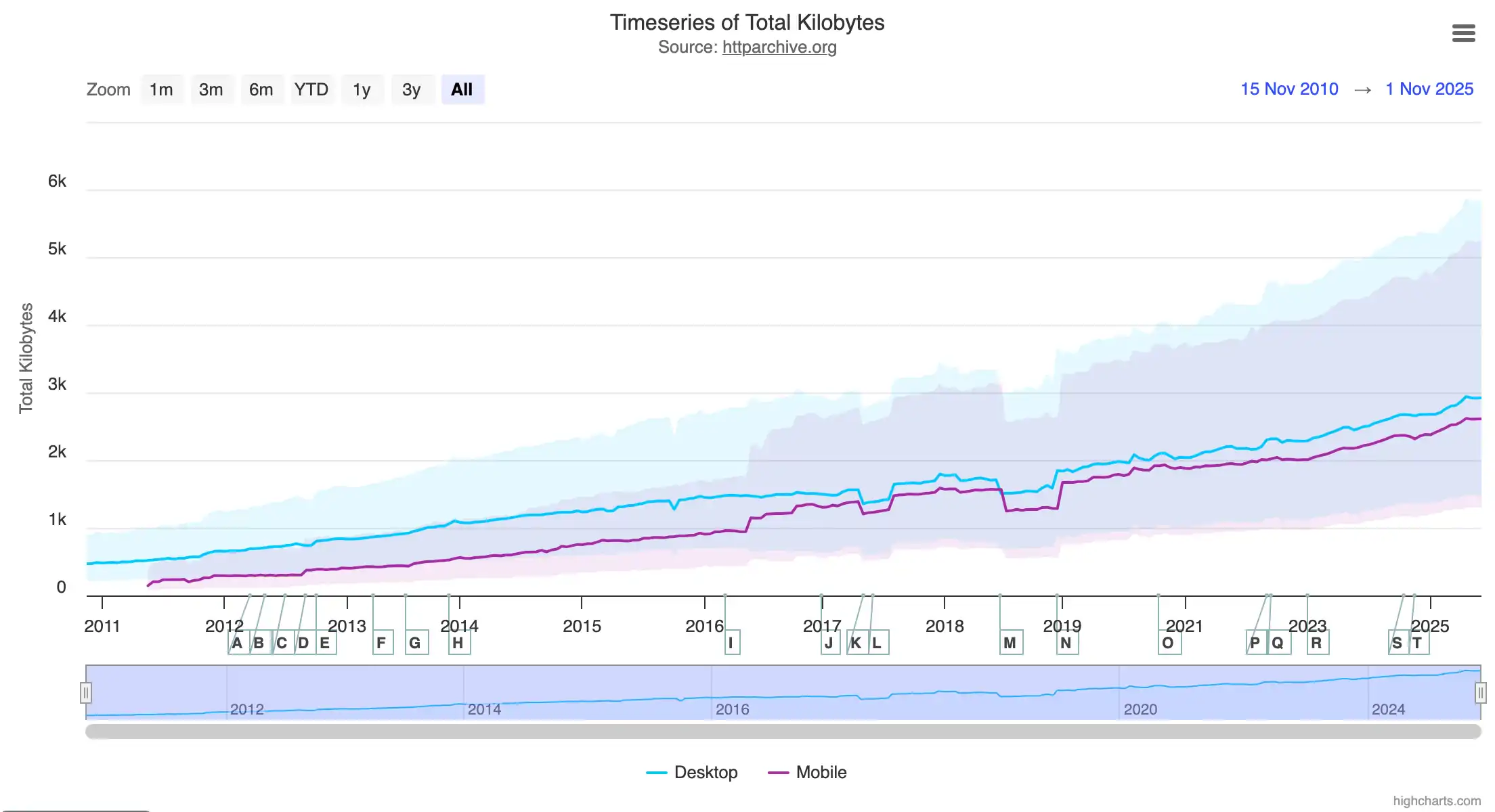 This diagram, taken from the HTTP Archive website, shows that the median size of a web page was 0.47 MB in 2010. Today, the median page weighs 2.9 MB, which is six times more.