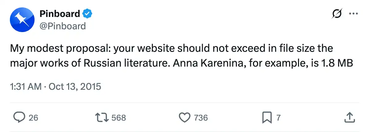 For another point of comparison, I like to quote this tweet from Pinboard: “Your website should not exceed in file size the major works of Russian literature.” He mentions a novel that weighs 1.8 MB.